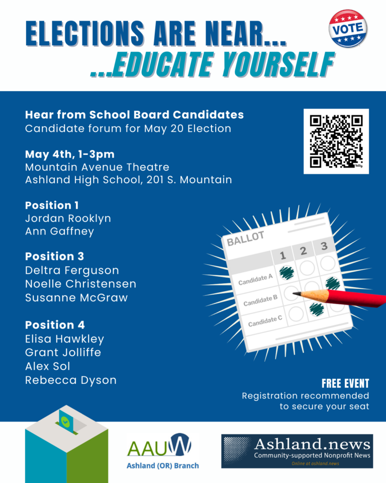 Nine candidates will be interviewed and audience questions will be addressed at the end of the 2-hour Ashland School Board Candidate Forum, co-sponsored by American Association of University Women (AAUW) and ashland.news, an on-line non-profit newsletter.