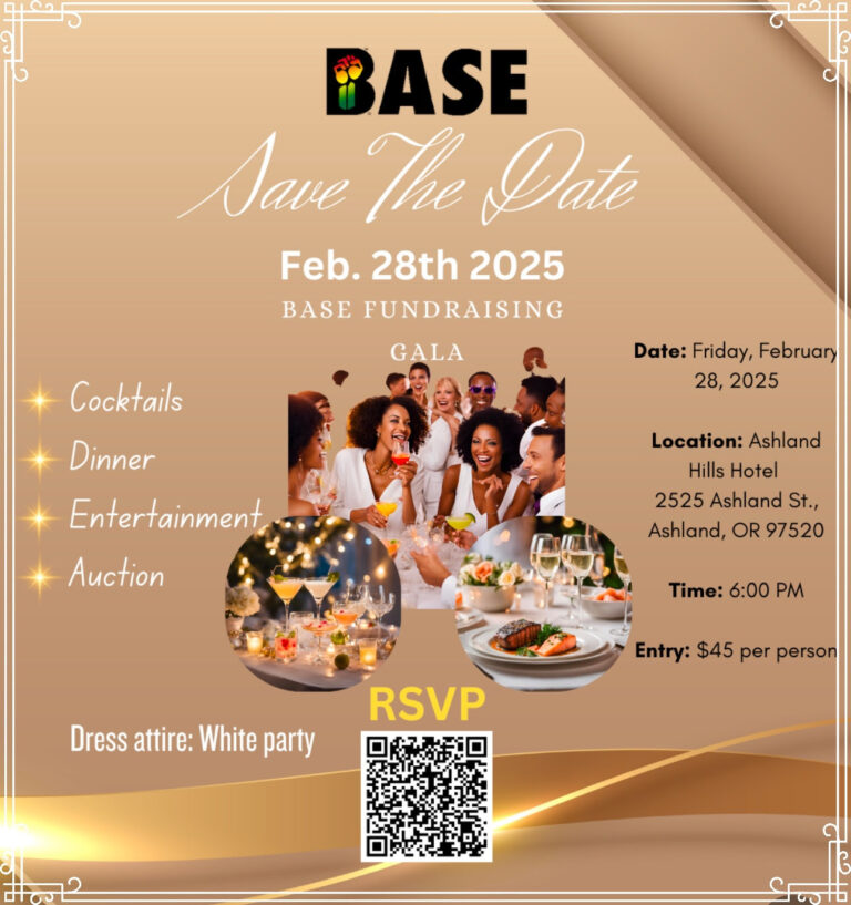 BASE invites the community to an elegant evening of inspiration, connection, and impact at its fundraiser to support its work to create meaningful change in Southern Oregon. BASE works to empower youth, celebrate culture, and foster community connection. Enjoy cocktails and socializing, followed by a delicious dinner, an auction, and entertainment featuring a live band, stand-up comedy, and keynote speakers. If you’d like to support the event by donating items or services to the auction, please contact Darice Johnson at djohnson@baseoregon.org. To RSVP go here. See more about BASE here.