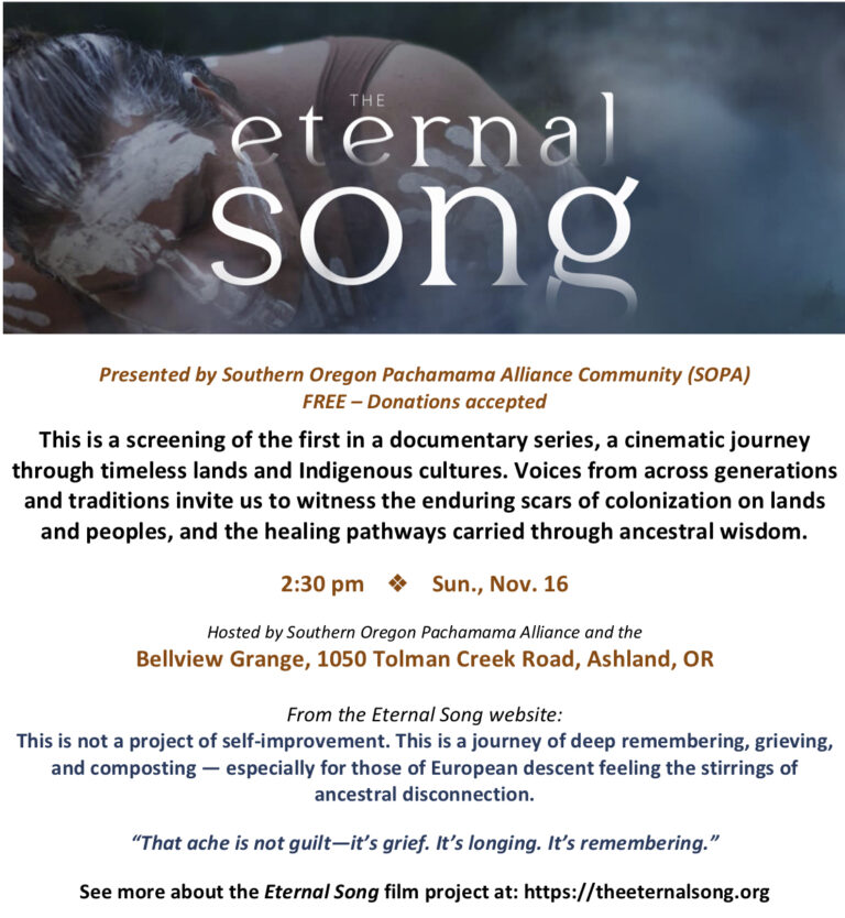 This free screening of the first in a documentary series a cinematic journey through timeless lands and Indigenous cultures. Voices from across generations and traditions invite us to witness the enduring scars of colonization on lands and peoples, and the healing pathways carried through ancestral wisdom. Presented by Southern Oregon Pachamama Alliance (SOPA) community.