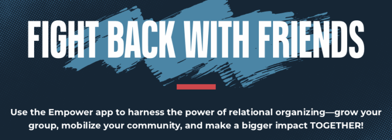 Fight Back With Friends! is a national program designed to help you activate your community! Using Indivisible’s Empower app, we’ll equip you with the tools to connect with friends, family, and neighbors who need YOUR voice to get civically engaged. Join us on the fourth Tuesday of every month for a one-hour training session, where we’ll onboard new participants and introduce fresh calls to action that make a real impact. The call starts at 5 p.m. PT Register for the call here.