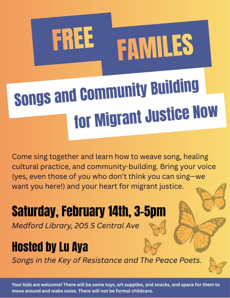 Come sing together and learn how to weave song, healing cultural practice, and community-building. Bring your voice (yes, even those of you who don’t think you can sing—we want you here!) and your heart for migrant justice. Hosted by Lu Aya of Songs in the Key of Resistance and The Peace Poets.