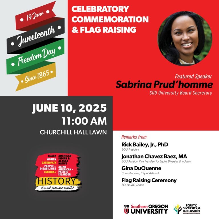 This Juneteenth celebratory commemoration and flag raising will feature Sabrina Prud’homme, SOU University Board Secretary; Churchill Hall Lawn Remarks from Rick Bailey, Jr., PhD; SOU President Jonathan Chavez Baez; MA SOU Assistant Vice President for Equity, Diversity, & Inclusion Gina DuQuenne Councilwoman; City of Ashland Flag Raising Ceremony, SOU ROTC Cadets