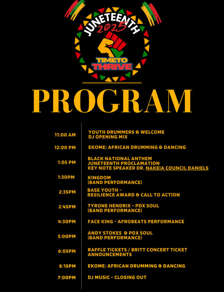 The event will include activities for grown-ups and children throughout the day. The Kids’ Zone will feature music, interactive activities, face painting, and games. The main stage will feature stars from across the Pacific Northwest: Rogue Valley DJs, Ekome Drumming Band, Kingdom, FaceKing Afrobeats, PDX Soul together with Tyrone Hendrix and Andy Stokes, plus performances from BASE Youth.