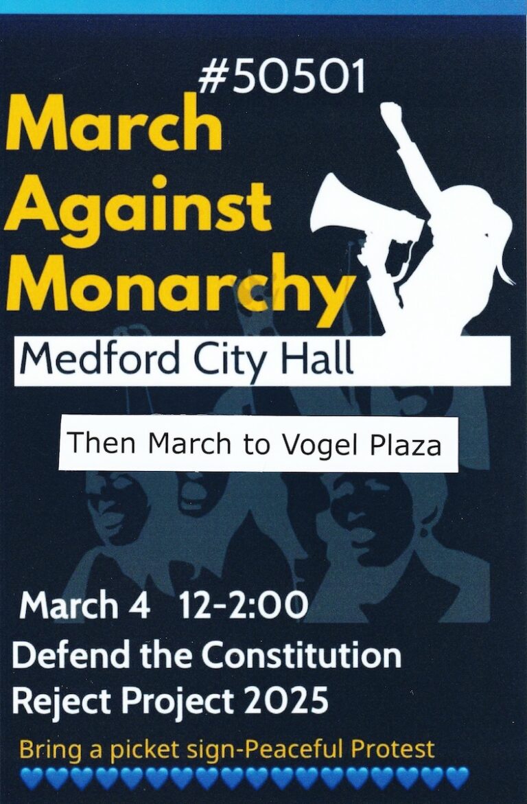 Another rally called for by 50501 is being organized in Medford from 12 noon to 2 pm Tuesday, March 4th, gathering first at City Hall and followed again by a march to Vogel Plaza. The signs people have made for these rallies have been amazing. Click here to see photos of the Feb. 17th rally at Vogel Plaza.
