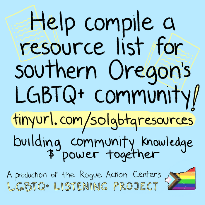 - Rogue Action Center LGBTQ+ Listening Project – several committees working on identifying needs of queer community, organizing events, and amplifying QTBIPOC voices in southern Oregon. Visit rogueactioncenter.org/lgbtq-listening-project for info or sign up to volunteer.