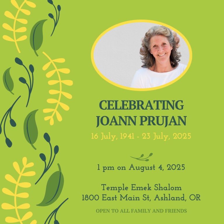 Join JoAnn Prujan’s friends and family in a Celebration of Life on Monday, August 4 at 1 p.m. at Temple Emek Shalom in Ashland.
